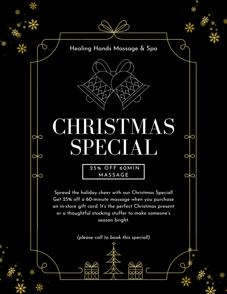 Give the gift of relaxation this holiday season with Healing Hands Massage & Spa. Limited-time Christmas offer — don’t miss it!